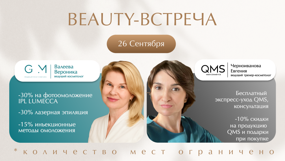 Вас ждёт встреча с ведущим косметологом GM Clinic Вероникой Валеевой, тренером-косметологом QMS Евгенией Черноивановой и день красоты, наполненный заботой, выгодой и атмосферой праздника